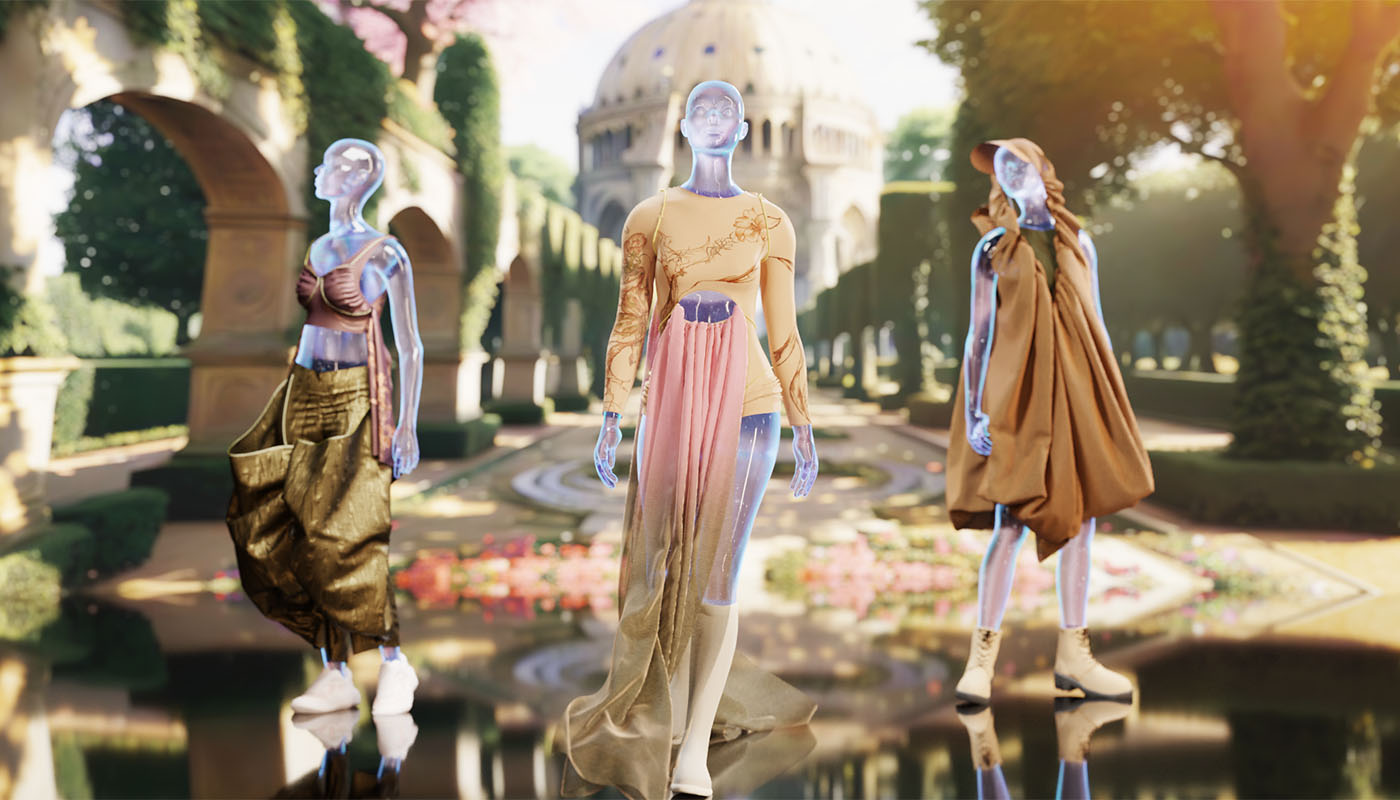 Digitally crafted in CLO3D by the talented graduate students of Istituto Marangoni and with the aid of AI tools, the collections stretch from the physical runway to the digital reality.
