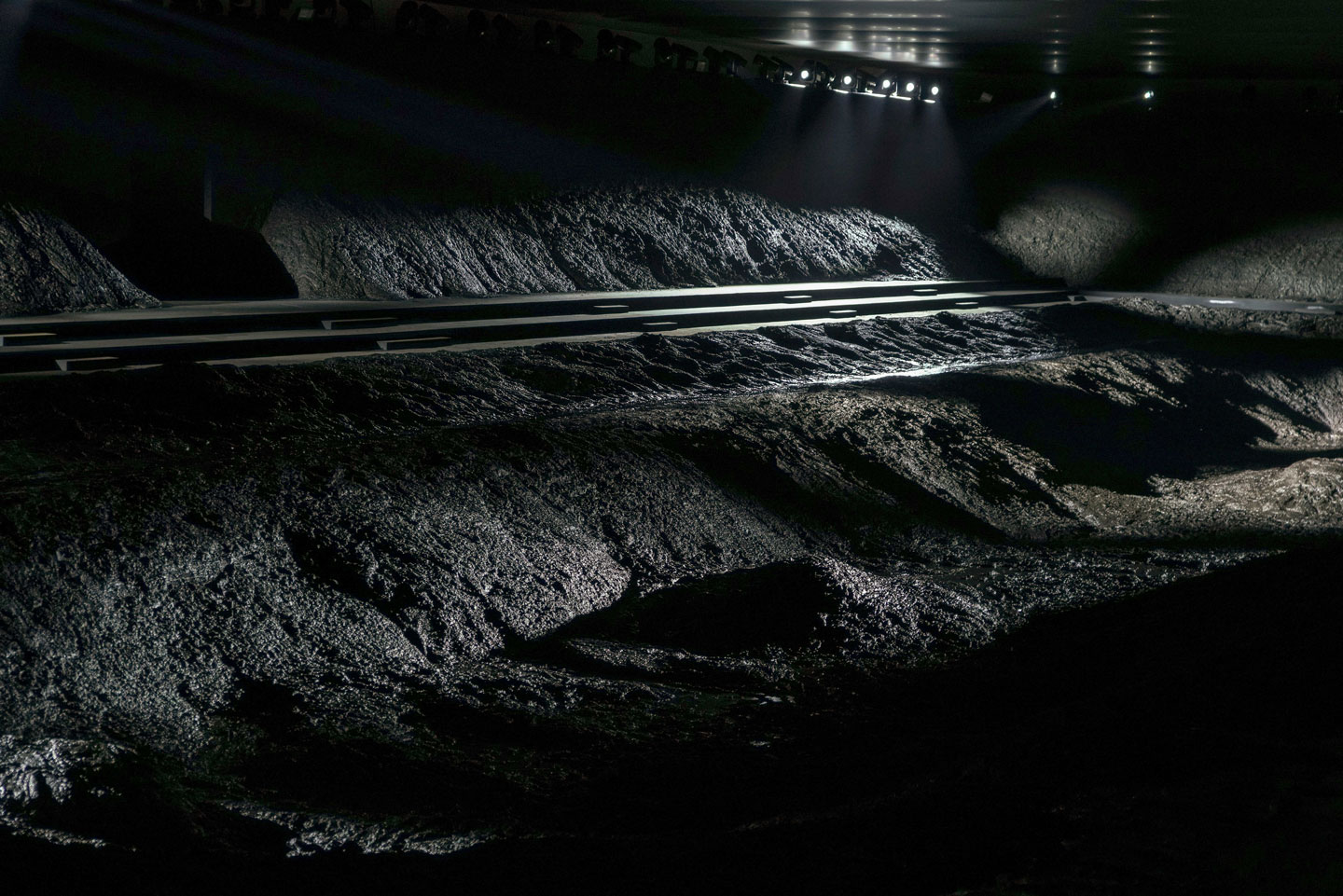 At Balenciaga, creative director Demna decided to truck 275 cubic meters of black mud into the middle of a convention center on the outskirts of Paris