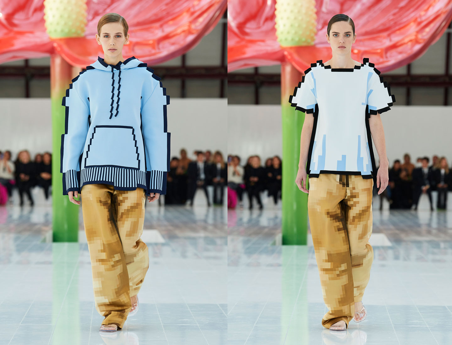 At Loewe, Jonathan Anderson impressed the public with handmade looks featuring pixelated squares
