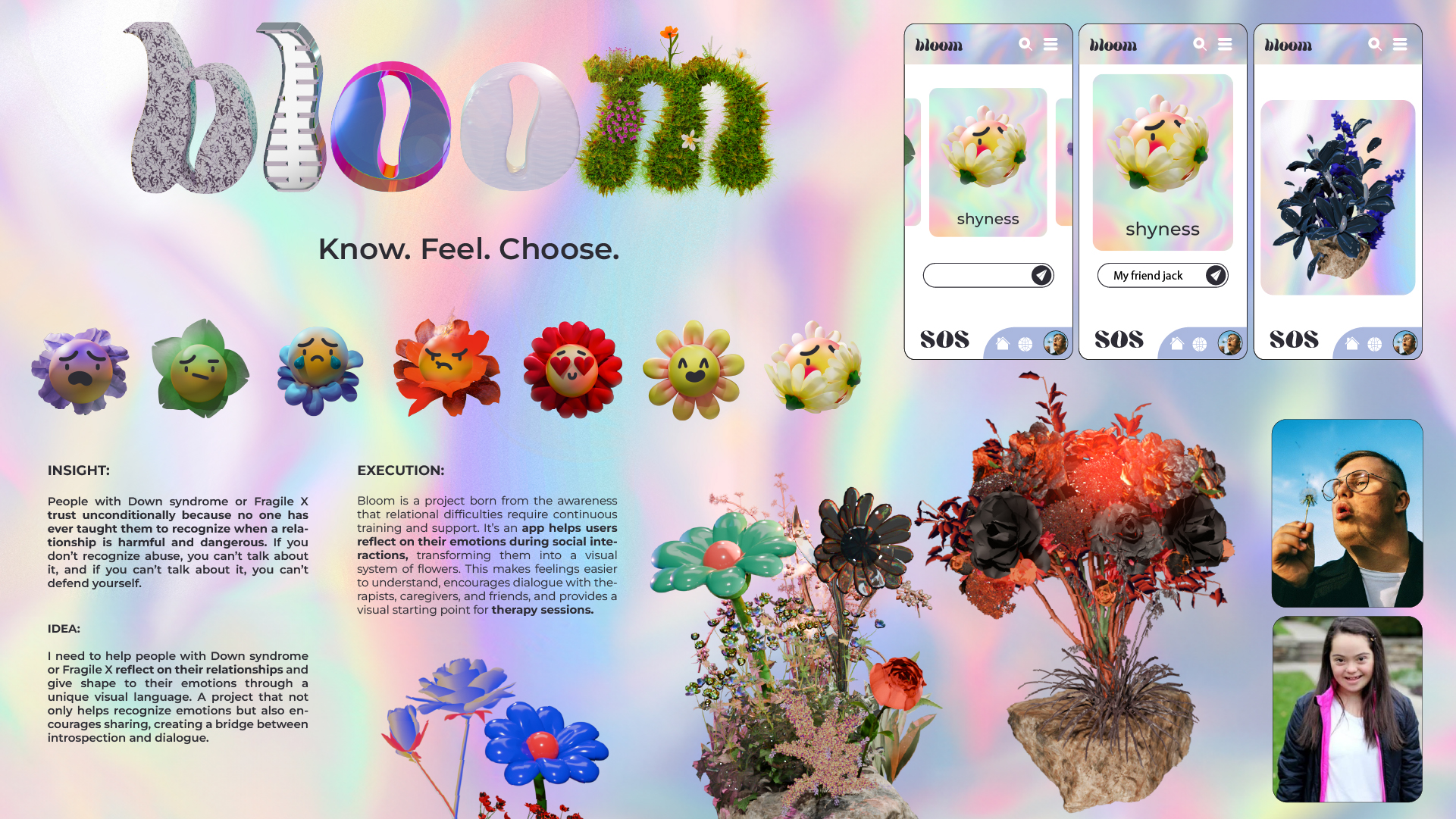 Bloom, developed by Davide Lazzoni, addresses the emotional experiences of people with Down syndrome through a social communication framework grounded in research, listening and participation. The project proposes a collaborative, ethically grounded design model, in which the process is as significant as the outcome.