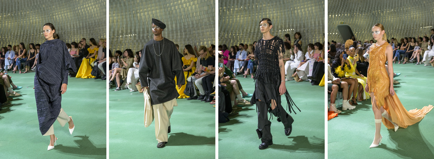 From left to right, looks designed by: Pedro del Campo Criollo, Young Eun Jeon, Guillermo Hidalgo, Tia Najjar