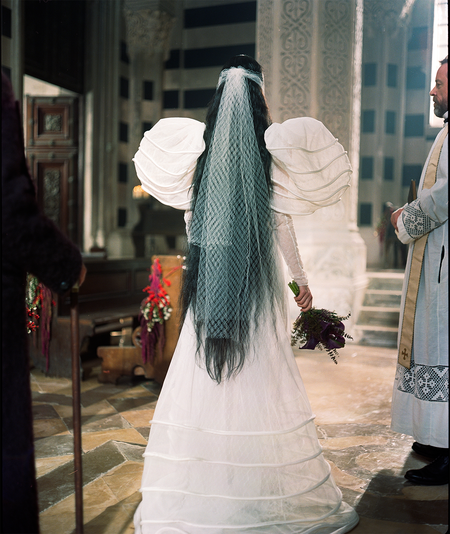 The concept became even more tangible during the wedding scene, where Waddington opted for a braid dress made of see-through fabric, an unconventional choice for the occasion. The sleeves were exaggeratedly swollen for one last time, evoking a sense of confinement and desired liberation. This feeling was conveyed through the delicate, almost transparent veil and the circular cuts, serving as mere adornments for the piece.