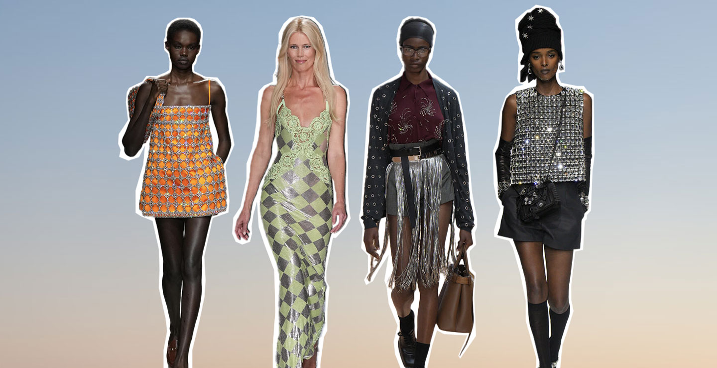 Knowing how to dose crystals is a gift, as is how to dose them to create a casual outfit suitable for everyday life. The combination of Giorgio Armani trousers with a crystal dress is a great inspiration for an elegant, quintessentially Armani-style evening outfit. At Prada, Miuccia Prada and Raf Simons opted for crystal-studded knitwear, adding decorative details such as belts with metallic fringes and perforated eyelets.