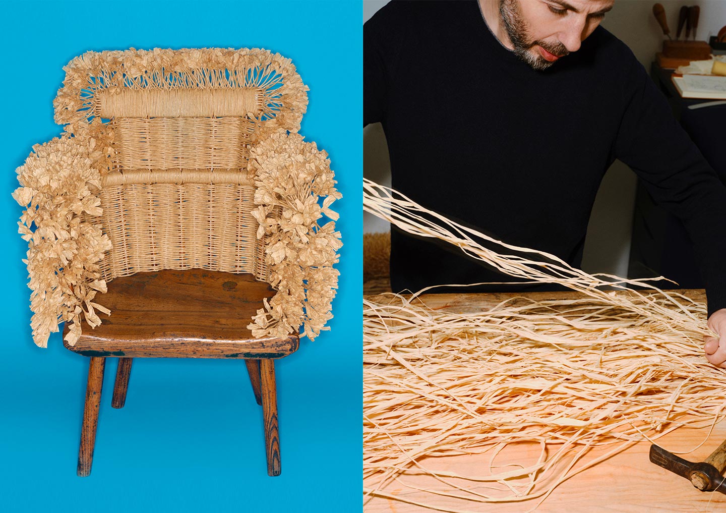 Loewe returned to the Salone del Mobile with a collection of chairs reimagined by artisans to become unique items. Chairs were embellished with natural fibres including raffia. © Loewe