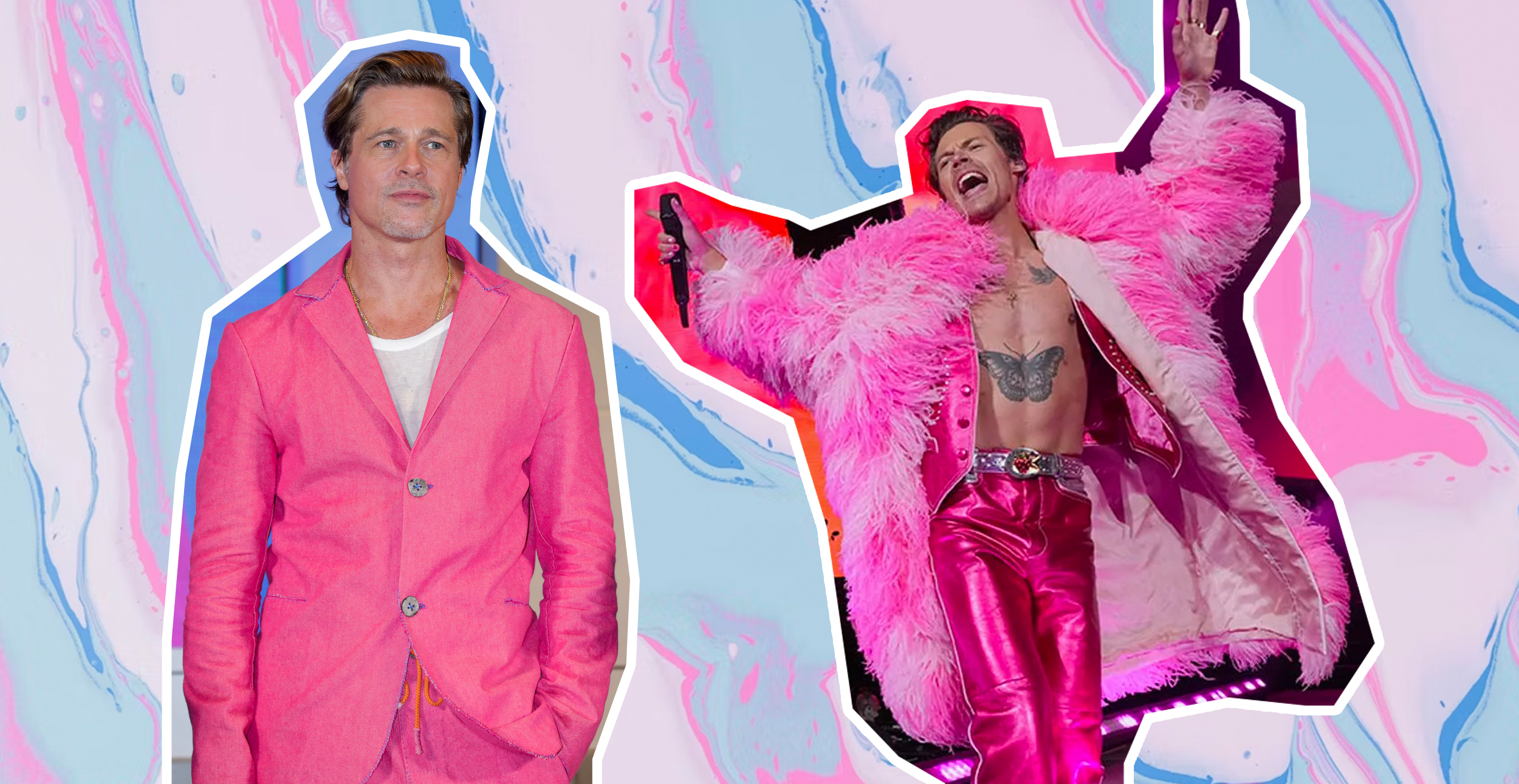 Harry Styles went viral with a pink Gucci eco-fur at Coachella 2022, while Brad Pitt showed up in total pink two-piece suit at the première of Bullet Train in Korea
