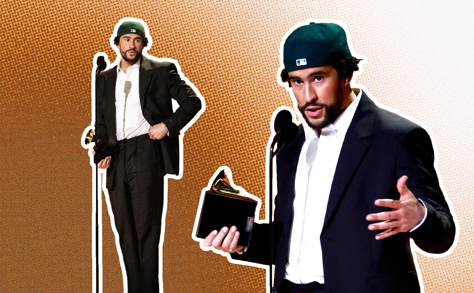 Bad Bunny, at the 2023 Grammy Awards, pairs a classic suit with a New Era Los Angeles Dodgers cap, featuring a grey under-brim, celebrating his win for Best Música Urbana album. Graphics by Constanza Coscia
