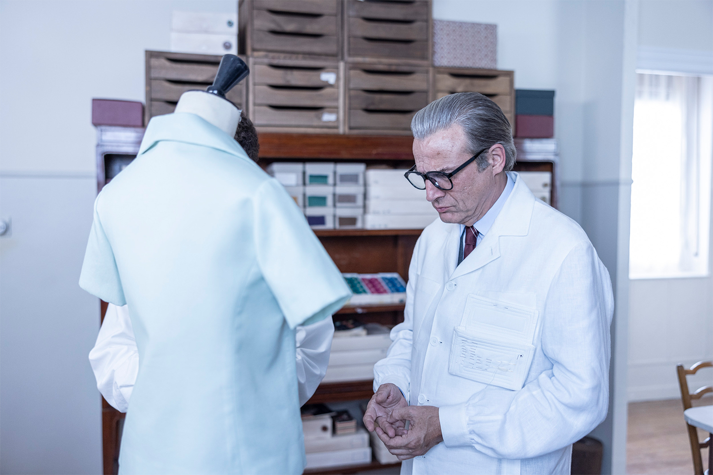 A scene from the Disney+ series "Cristóbal Balenciaga" depicting the salon de couture on Avenue George V in Paris. Photo by David Herranz, courtesy of Disney+.
