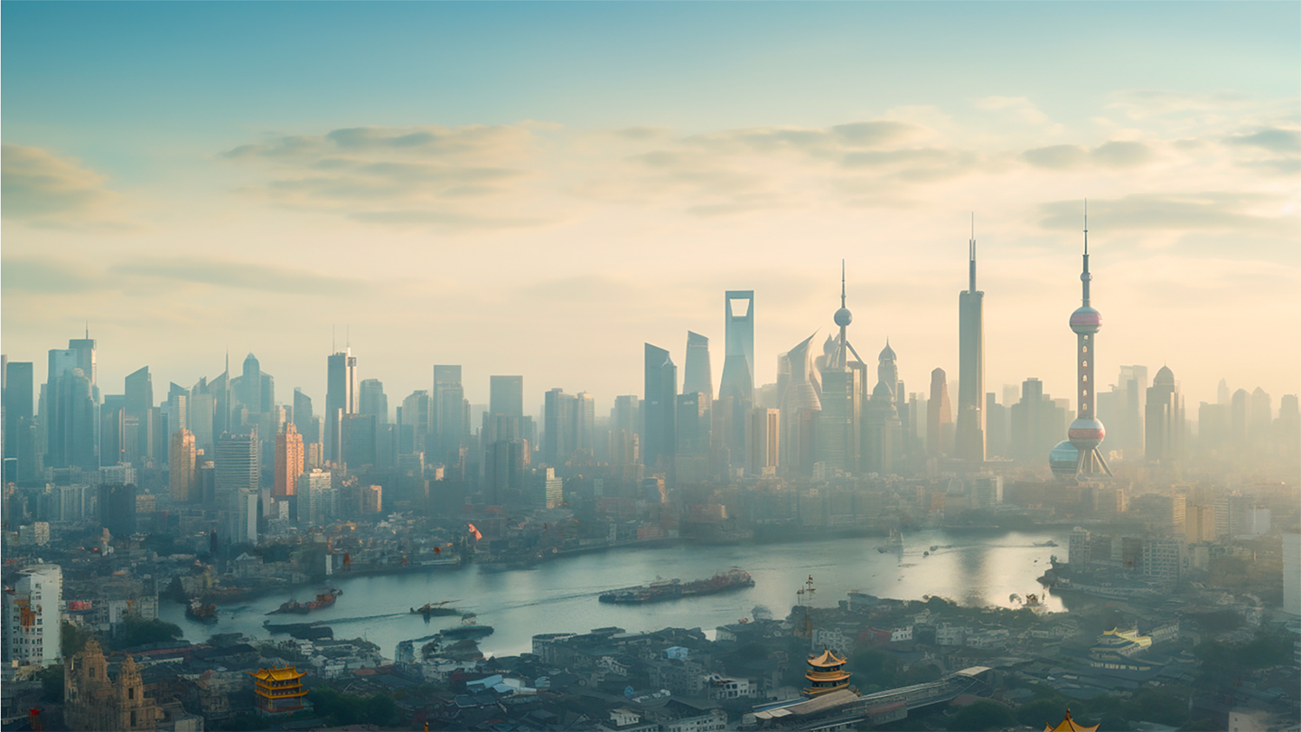 The AI-generated visual setting, like this Shanghai background, is powered by Monogrid