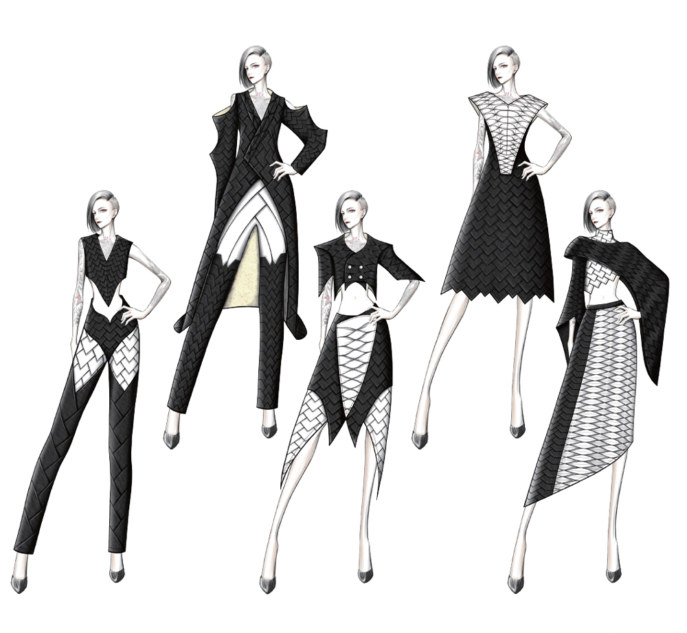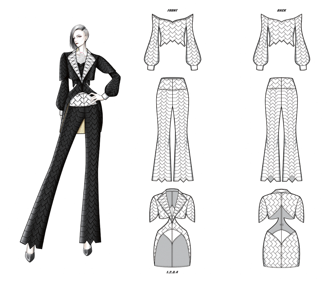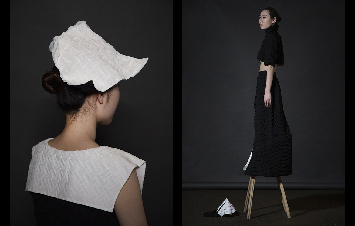 Presenting the portfolio collection The Hidden Fact with the i^4 capsule collection, Chengyuan Wang combined different skills while studying how to address consumer preferences for complex orders by applying mathematical formulas to garment surfaces to create intricate textures.