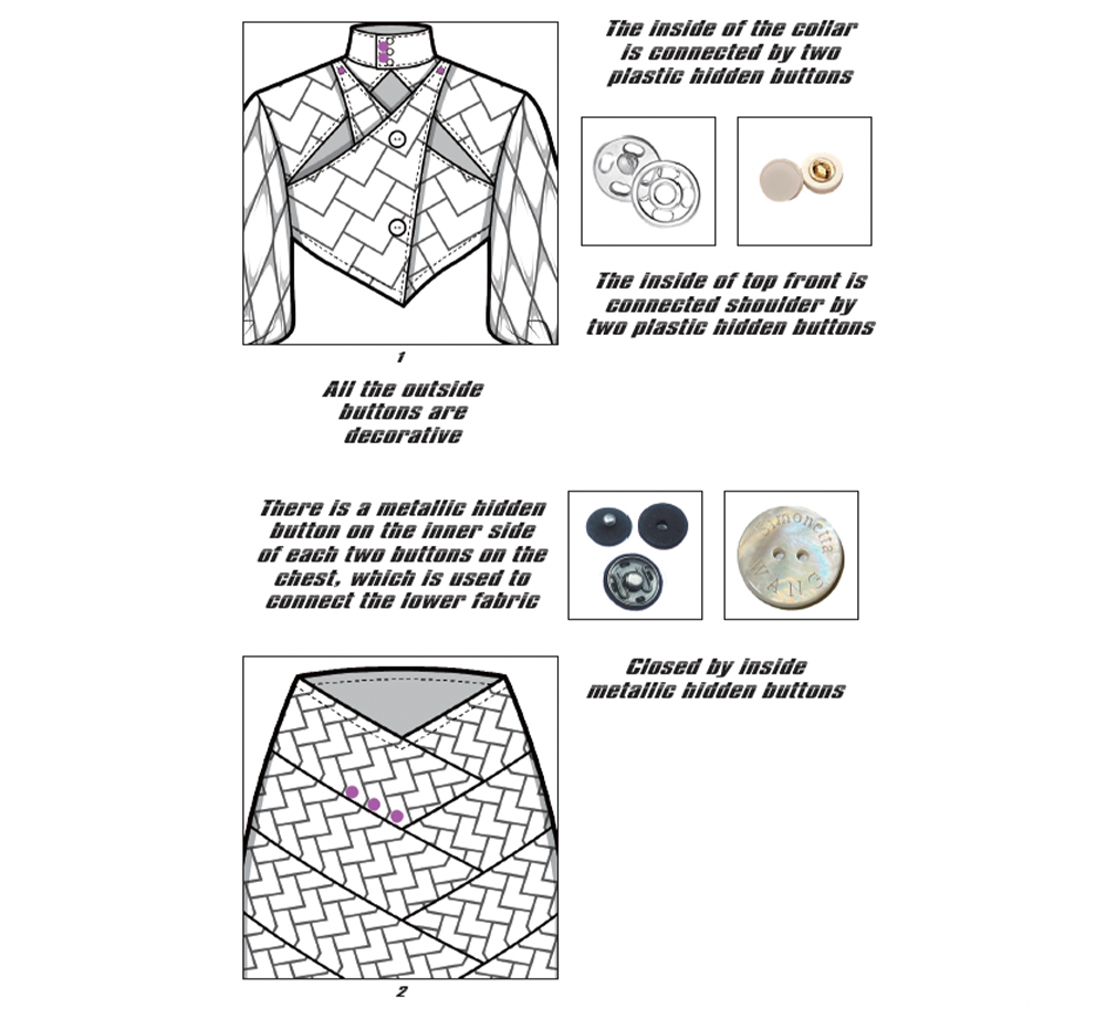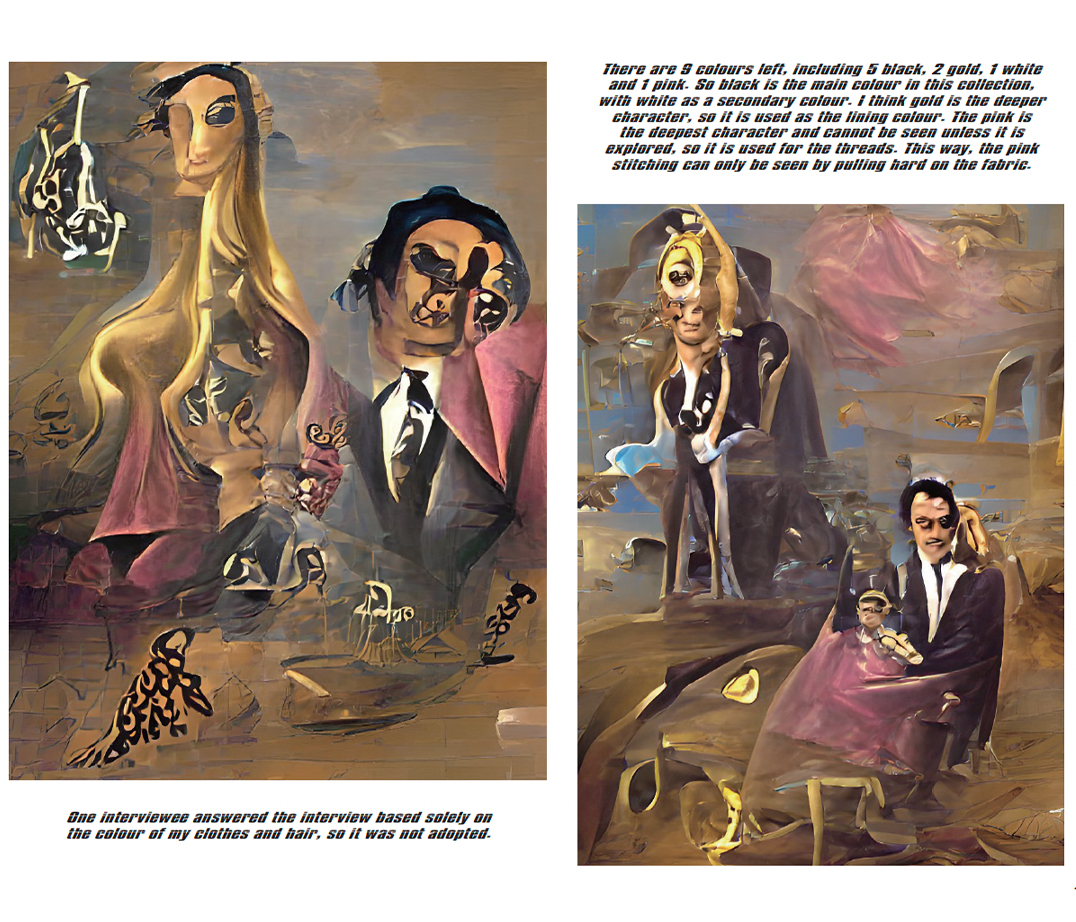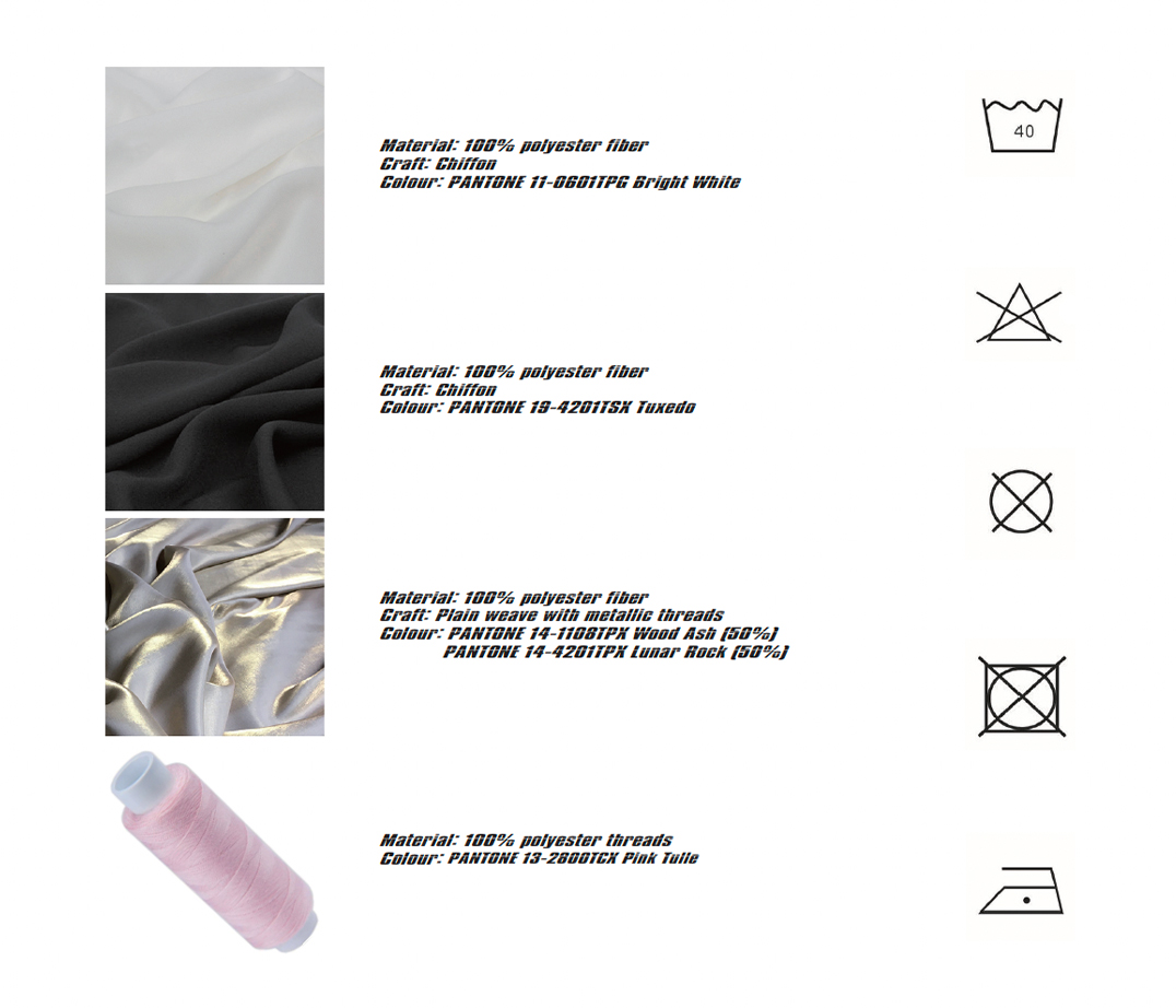 People described me by mentioning different colours: five votes for black, two for gold, one for white and one for pink. Black is, therefore, the main colour of this collection, while white is the secondary colour. I believe gold represents a deeper aspect of my personality, so I used it as the lining colour. Pink represents the deepest part of my inner character that cannot be perceived unless explored in depth, so I used this colour for the threads. This way, pink is only revealed when you pull the fabric tightly.