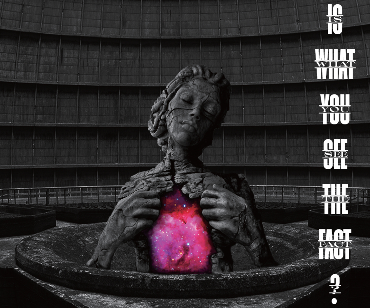 This is a sculpture by South African sculpture artist Daniel Popper. The universe-like images inside the chest are actually just pictures I generated automatically with Photoshop, just with different gold and pink colours. The universe contains countless things, just like a person with countless features. Pink and gold reflect abstract elements the respondents discovered after getting to know me. When these two pictures are combined, they show the desire to be seen for who they are instead of which big family they belong to. The background is an abandoned factory to highlight the part that looks like the universe; I created the background with Photoshop using a colour similar to the sculpture’s.