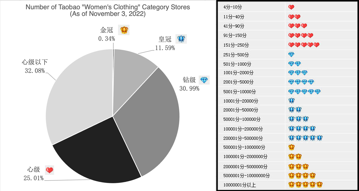 Data from taobao.com. Taobao members can make a credit evaluation on the transaction object every time they use Alipay to make a successful transaction on Taobao.com. The evaluation is divided into three categories: “Praise”, “Medium”, and “Bad”. Each evaluation corresponds to a credit point: “Praise” plus one point, “Medium” with no added points, and “Bad” deducted one cent