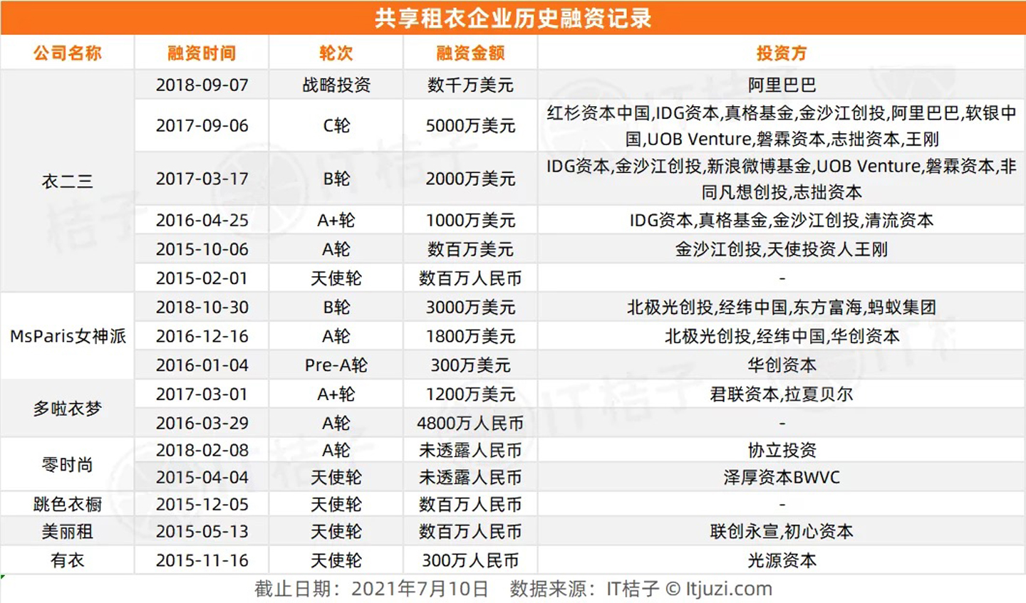 Data from itjuzi.com. Sharing the historical financing records of shared clothing rental enterprises: YCloset completed 6 rounds of financing, with a total financing amount of about 738 million yuan