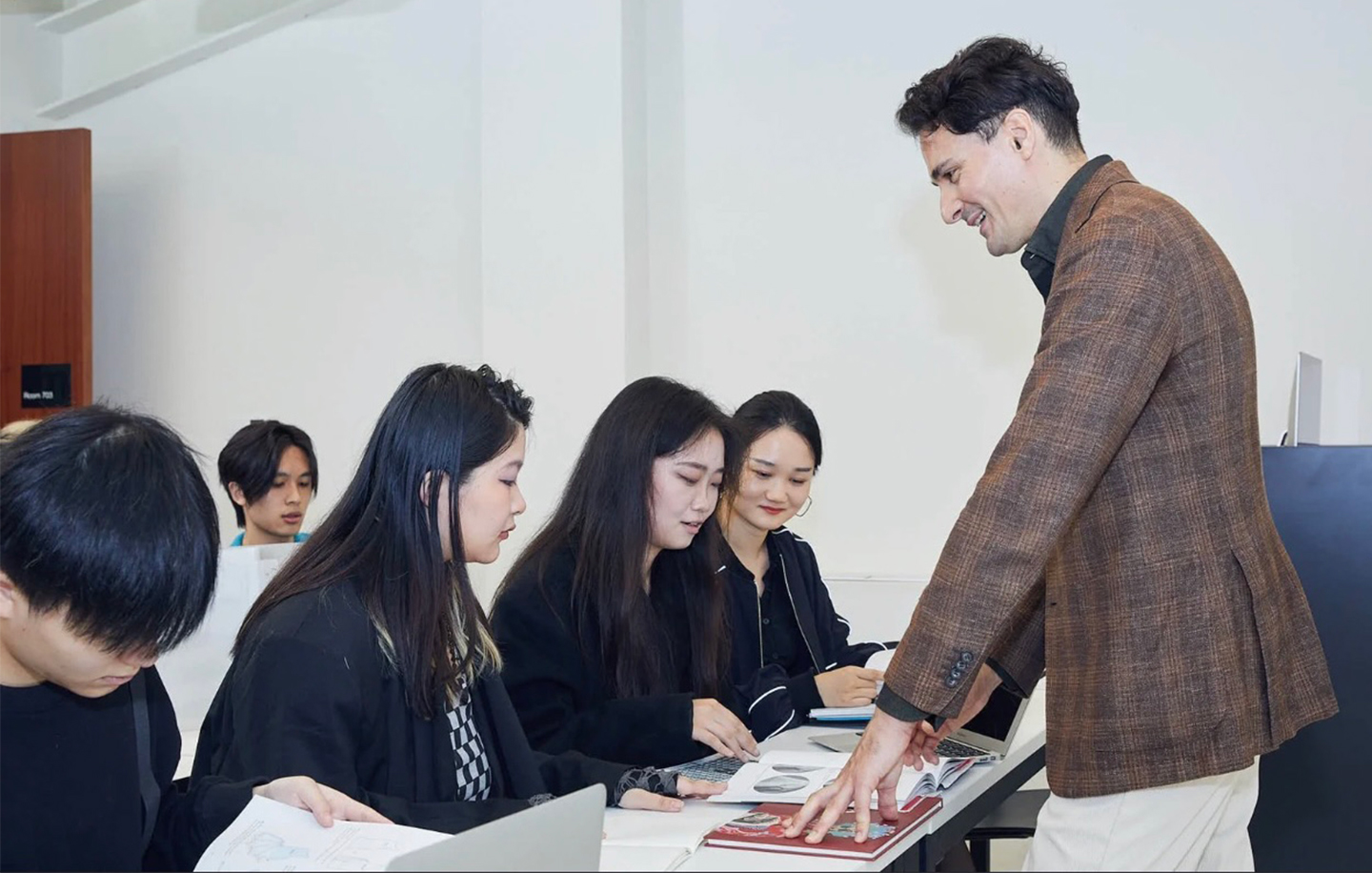Students working with Professor Federico Castigliano during a creative writing lesson at Istituto Marangoni Shanghai