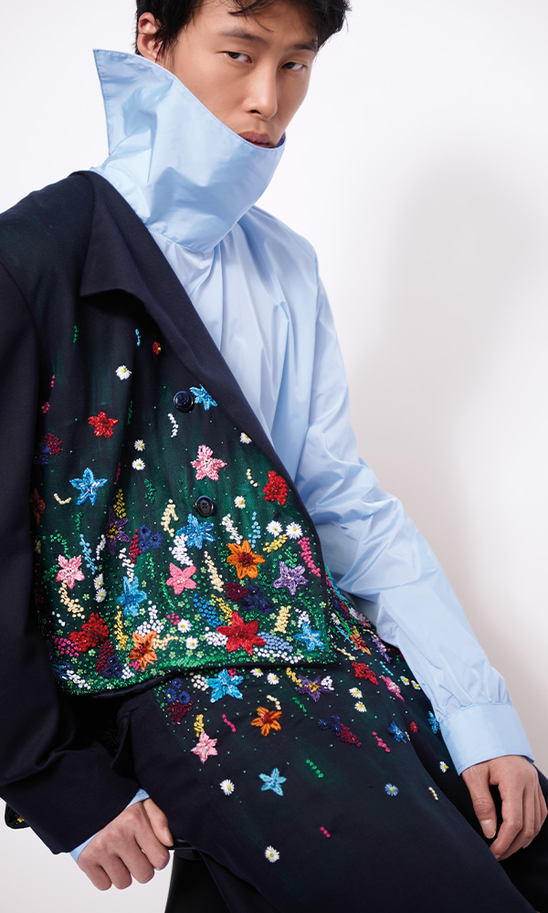 Soft petal pinks thread through seams, floral embroidery blooms across fabrics, vibrant hues flow organically from one piece to the next. Where structure loosens, nature takes over — formality unravels to make room for wild spontaneity. These are quiet revolutions: never loud, but radically free. A new kind of sartorial softness emerges, marked by the untamed flourish of embroidery in bloom.