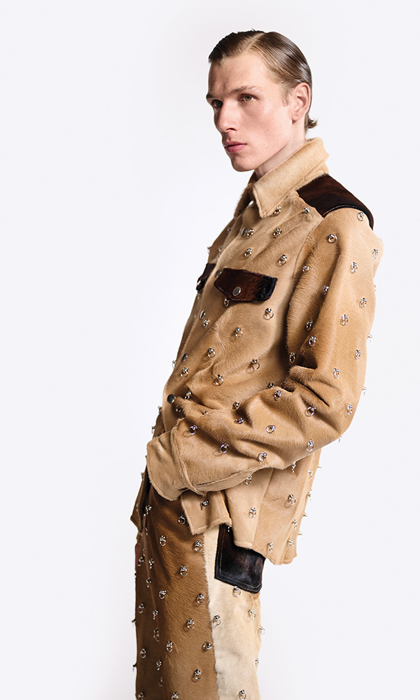 The silhouettes emerge at the intersection of tactile leather and the rawness of the unfinished, where material itself becomes narrative. Concrete and flowers, leather and nylon, studs and embroidery — everything collides in a continuous tension between memory and rejection, the complete and the incomplete.